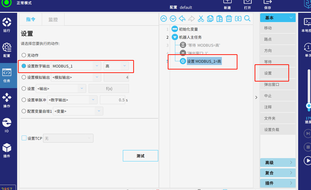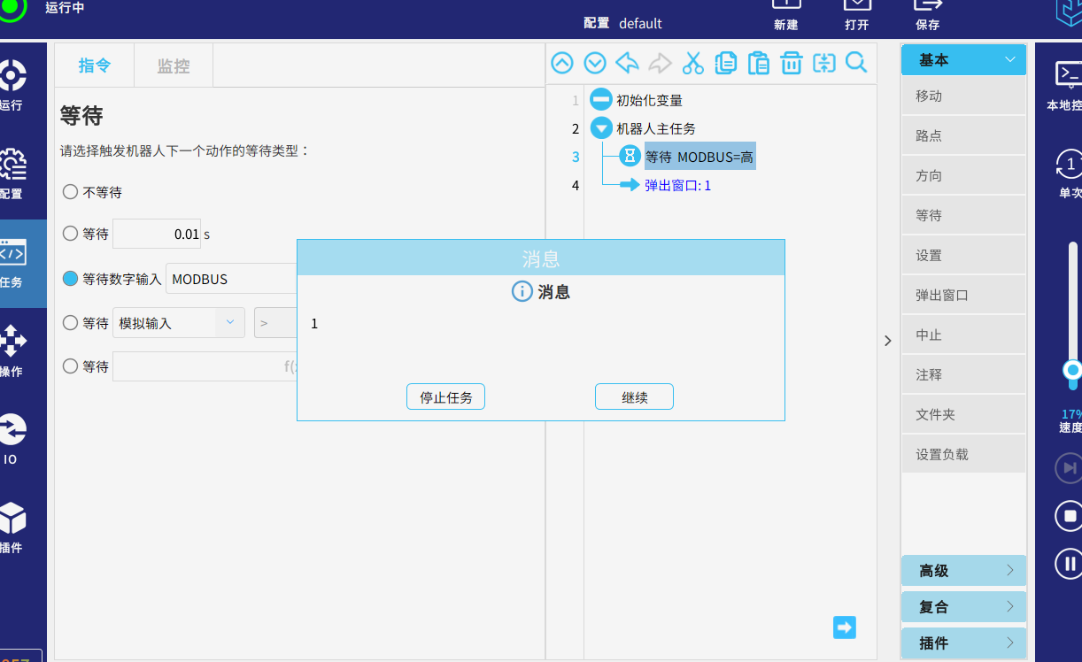 運行任務,當從站的信號modbus=高 時 ,頁面彈出窗口提示“1”,代表已獲取到該mosbus