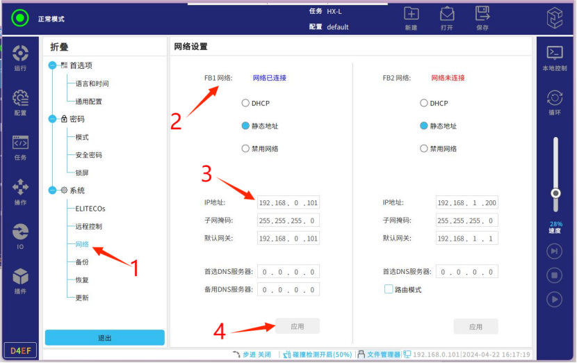 第三步-選擇網(wǎng)絡(luò)——FB1網(wǎng)絡(luò)(靜態(tài)地址)——輸入(IP地址,子網(wǎng)掩碼,默認(rèn)網(wǎng)關(guān))——點(diǎn)擊“應(yīng)用“(FB1網(wǎng)絡(luò)顯示網(wǎng)絡(luò)已連接則表示連上)