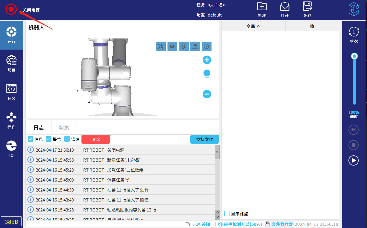 2.1.1首先先點擊示教器左上角的紅色圓圈