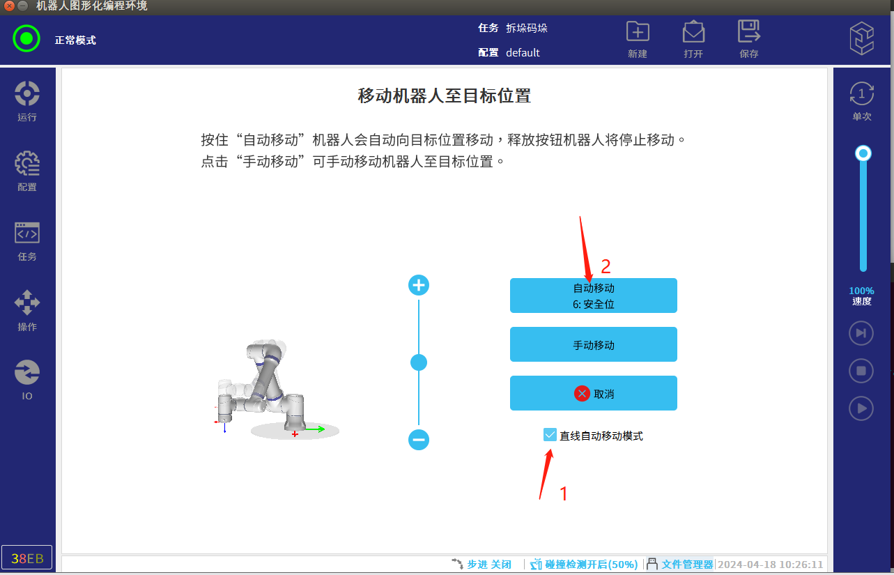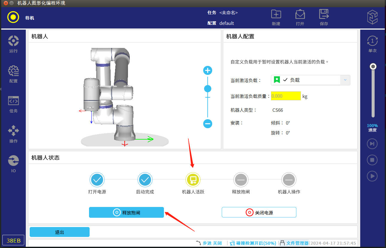 2.1.3等待機器人活躍變為黃色時,點擊左下角箭頭所示的釋放抱閘按鈕