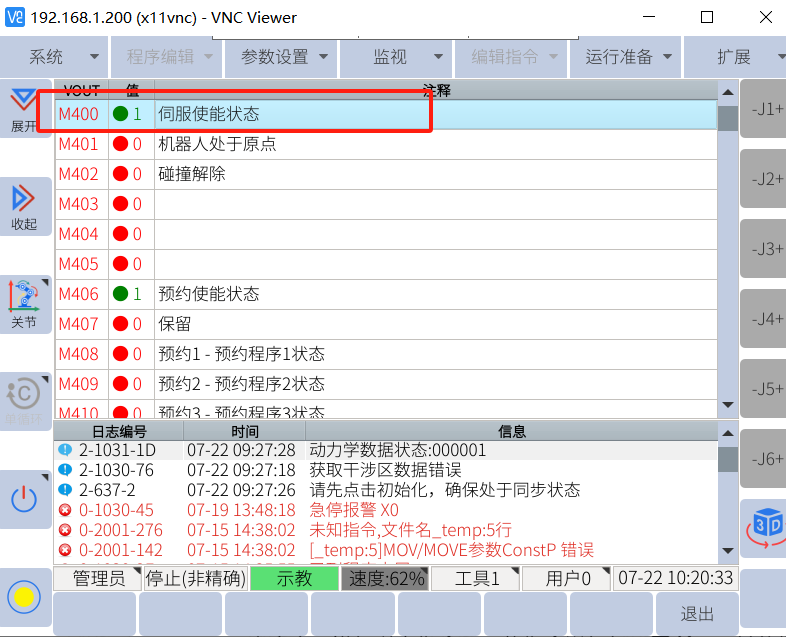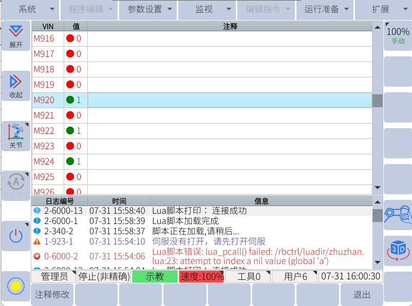 示教器中查看對(duì)應(yīng)的M920、M922、M924分別狀態(tài)為1,讀取線圈功能及指令正常