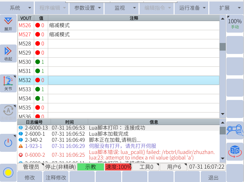 1. M0-M527,M1472-M1535為系統(tǒng)使用,只能讀取狀態(tài),通過示教器可輸入的 M 變量范圍為 528-799。