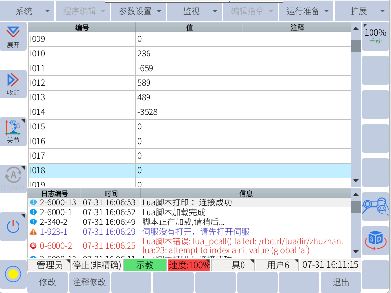 通過助手向寄存器300-304賦值,可通過示教器查看I0-I4數(shù)值,確實(shí)數(shù)值是否正確,如下圖所示