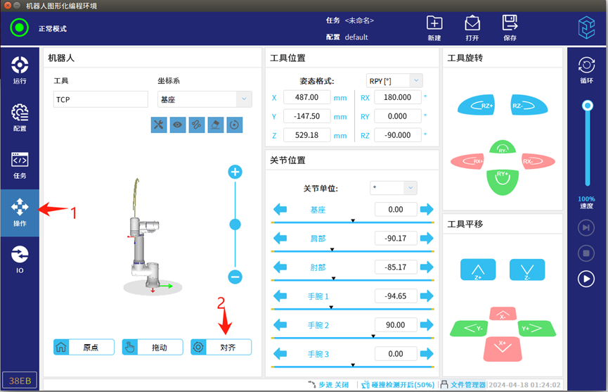 ● 自動對齊:使 TCP(工具坐標(biāo)) 和當(dāng)前選擇坐標(biāo)系(基坐標(biāo)/用戶坐標(biāo)),在 XOY 平面保持平行。