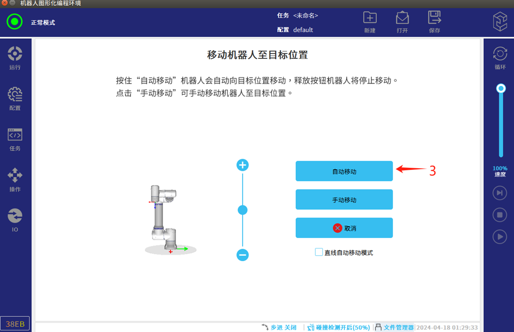 ● 進(jìn)入如下圖頁面,長按自動移動。(長按自動移動之前,確保周圍無干涉。如果有干涉先移動空曠地區(qū),再重新對齊)