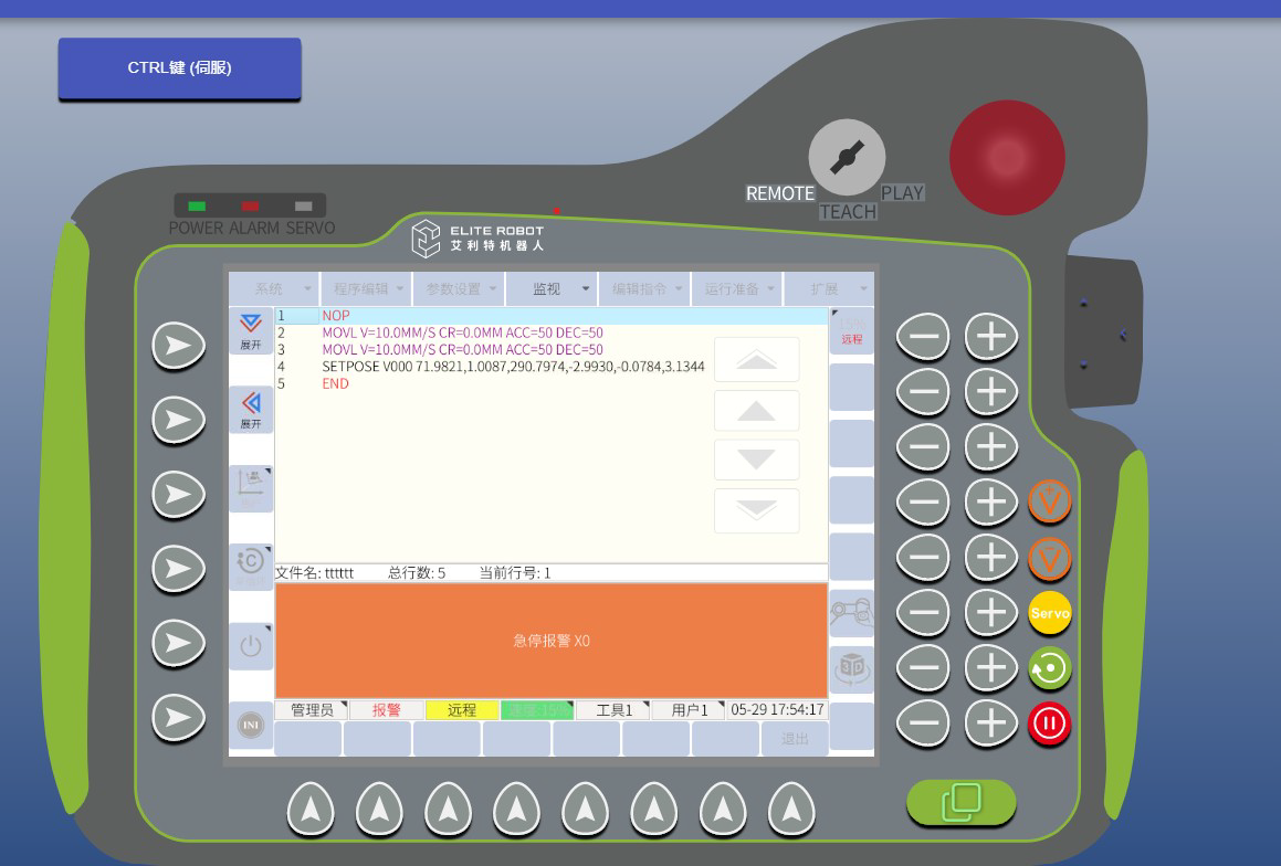 如下圖為機器人拔除示教器后未屏蔽示教器急停,有急停報警X0異常