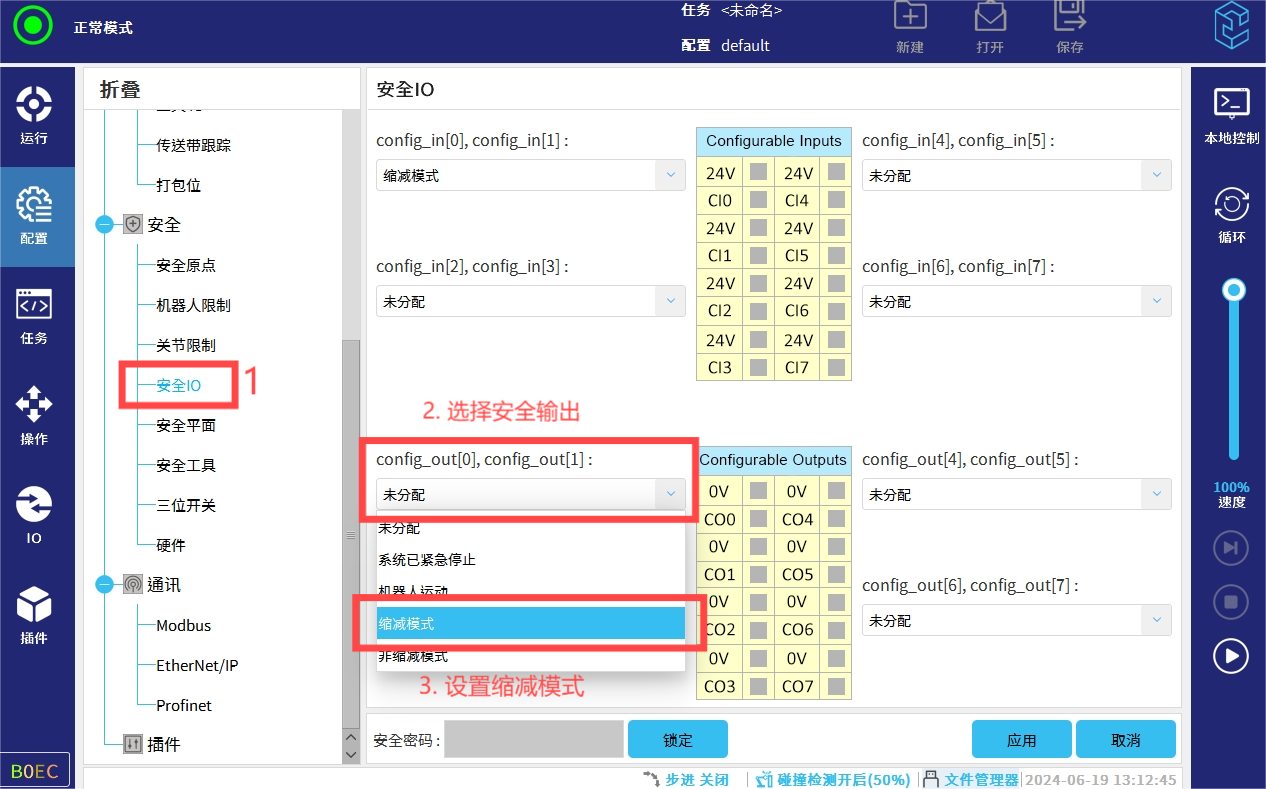 安全輸出縮減模式配置,在<配置-----安全io-----安全輸出config_out[0~7]-----縮減模式>。該功能的主要作用是當機器人本體處于縮減模式,或安全輸入配置了“縮減模式”輸入且當前信號為低電平時,將發送低電平信號;否則信號為高信號。