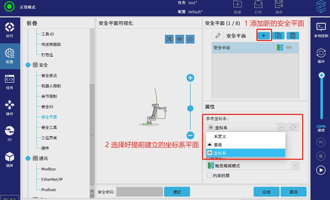 4. 選擇好之前建立的坐標系或者基坐標系,通過位置偏移來確定平面位置,該位置偏移是通過增加或者減小該坐標系的Z軸坐標來實現平面位置的偏移。該平面的Z+方向是正常區域,Z-方向是限制區域,機械臂工具中心點到達該平面及該平面Z-方向區域會觸發相應的約束模式,縮減模式或者防護停止。如果機械臂進入防護停止,會自動進入安全恢復模式,手動把機械臂的工具中心點移動到Z+方向上面,機械臂才能再次正常使用。