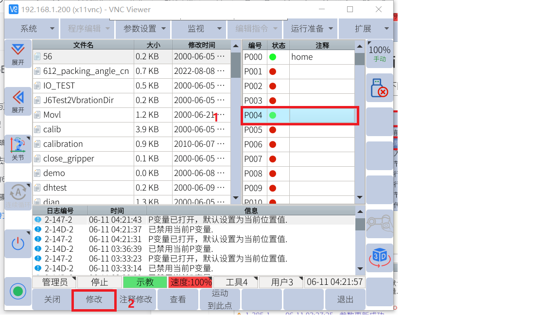 可以用p變量里輸入6個關節角度回打包位,如下圖步驟選用一個未使用的P變量并打開。根據圖片標簽步驟執行。
